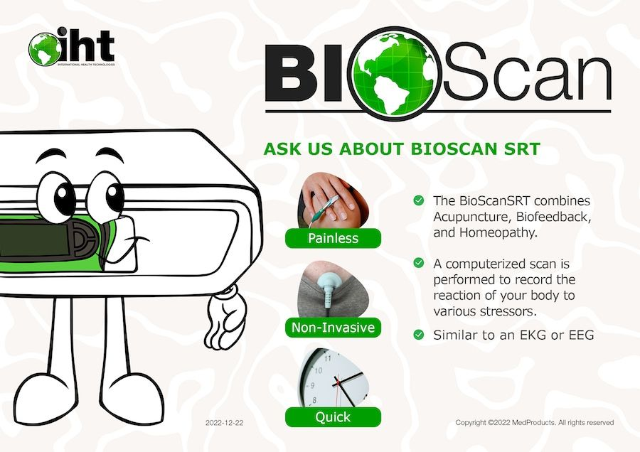 The BioScanSRT software is based on the physical fact that every substance has its own unique energy signal or energetic fingerprint or frequency. Using the FDA-Cleared BioScan System, the practitioner can scan thousands of these stressors in the office in just a few minutes. The scanning process allows the practitioner to test the effect of potential stressors on the body and then evaluate whether this stressor presents a problem.